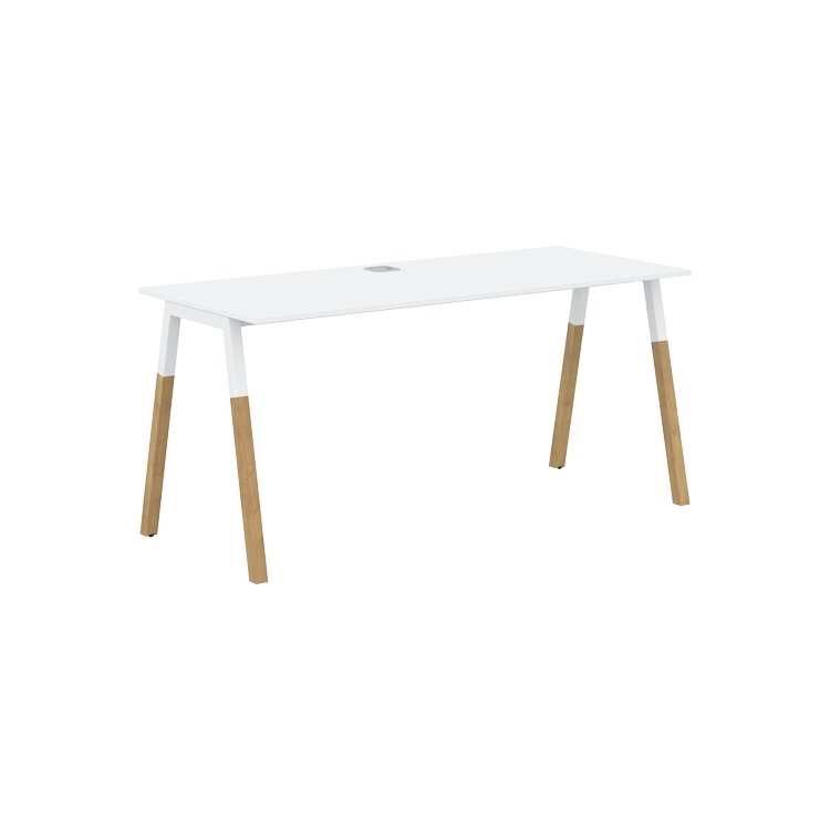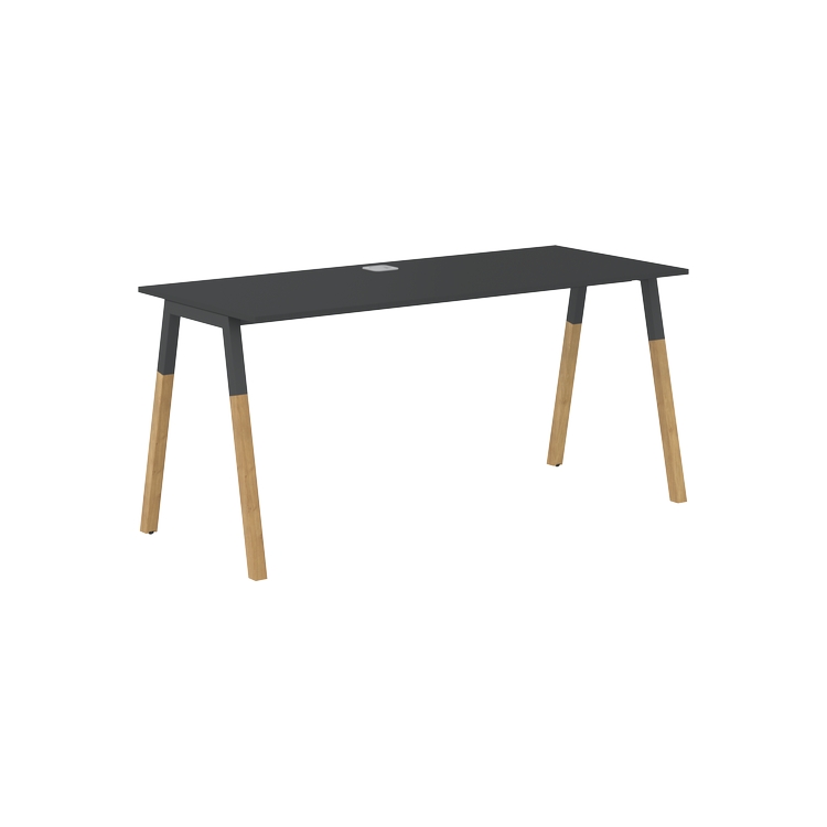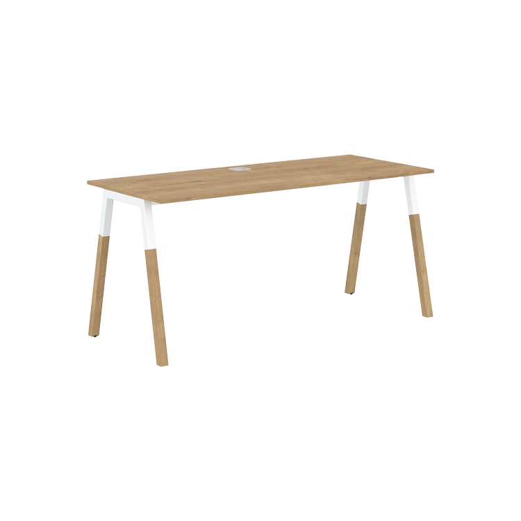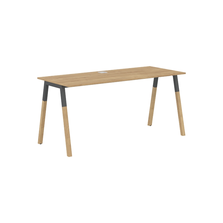Столешница прямолинейная из ЛДСП т.18 мм. c кромкой ABS т.2 мм, комплектуется квадратной заглушкой кабель-канала по центру, 2-мя траверсами и комбинированными опорами А-образной формы, верхняя часть из профиля трубы 40х40 мм и нижняя часть из массива бука; отделка – масло-воск.