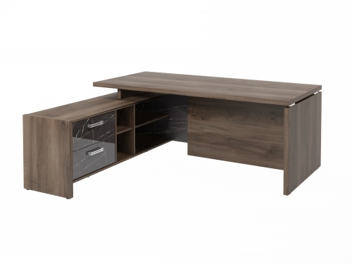 Столешница, бок стола и бок тумбы выполнены из ЛДСП толщиной 38 мм. Цвет - "Орех Пацифик Табак". Кромка 2 мм.